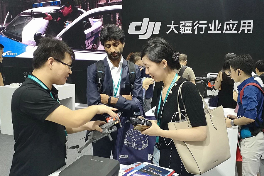 现场,许多观众和企业家都纷纷在DJI大疆行业应用展位前驻足观看和咨询。一旁的工作人员也进行细心的介绍引导和回答。